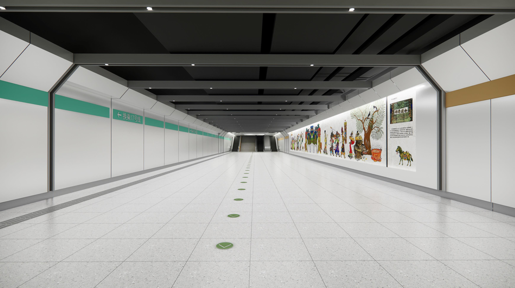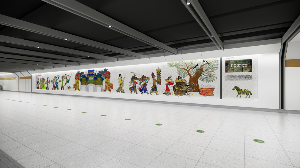 东大桥站原壁画《东岳古韵》创作完成于2012年11月,位于地铁6号线站厅内。随着东大桥站换乘改造工程实施,该作品现已迁移至当前位置。东岳庙现为北京民俗博物馆,壁画以东岳庙传统文化元素为创作蓝本,融汇历史底蕴与民俗风情,整体基调古朴厚重。壁画巧妙运用民间皮影的艺术语言,生动再现了老北京的民俗文化图景。作者宋长青。